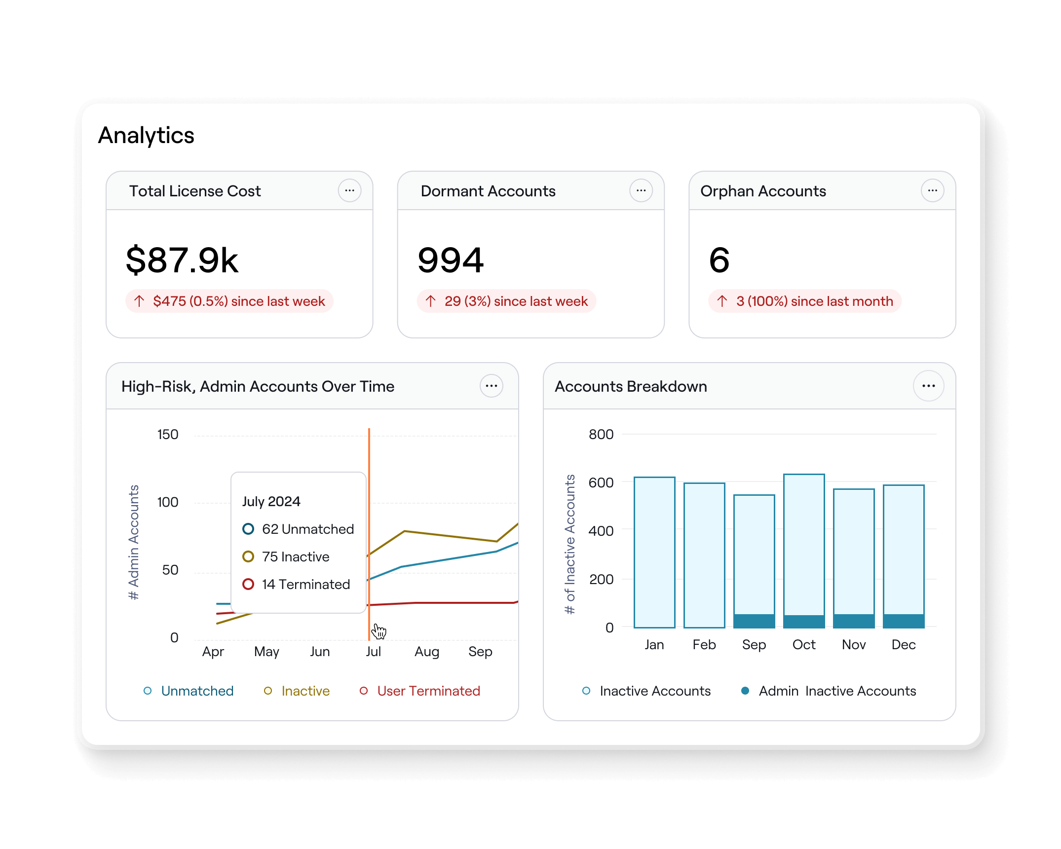 Start with out-of-the-box templates or build your own. Highlight license optimization, security posture, usage and adoption, shadow IT, and more. Filter by custom attributes, drill down from org to user and entitlement, and customize with a drag-and-drop layout.